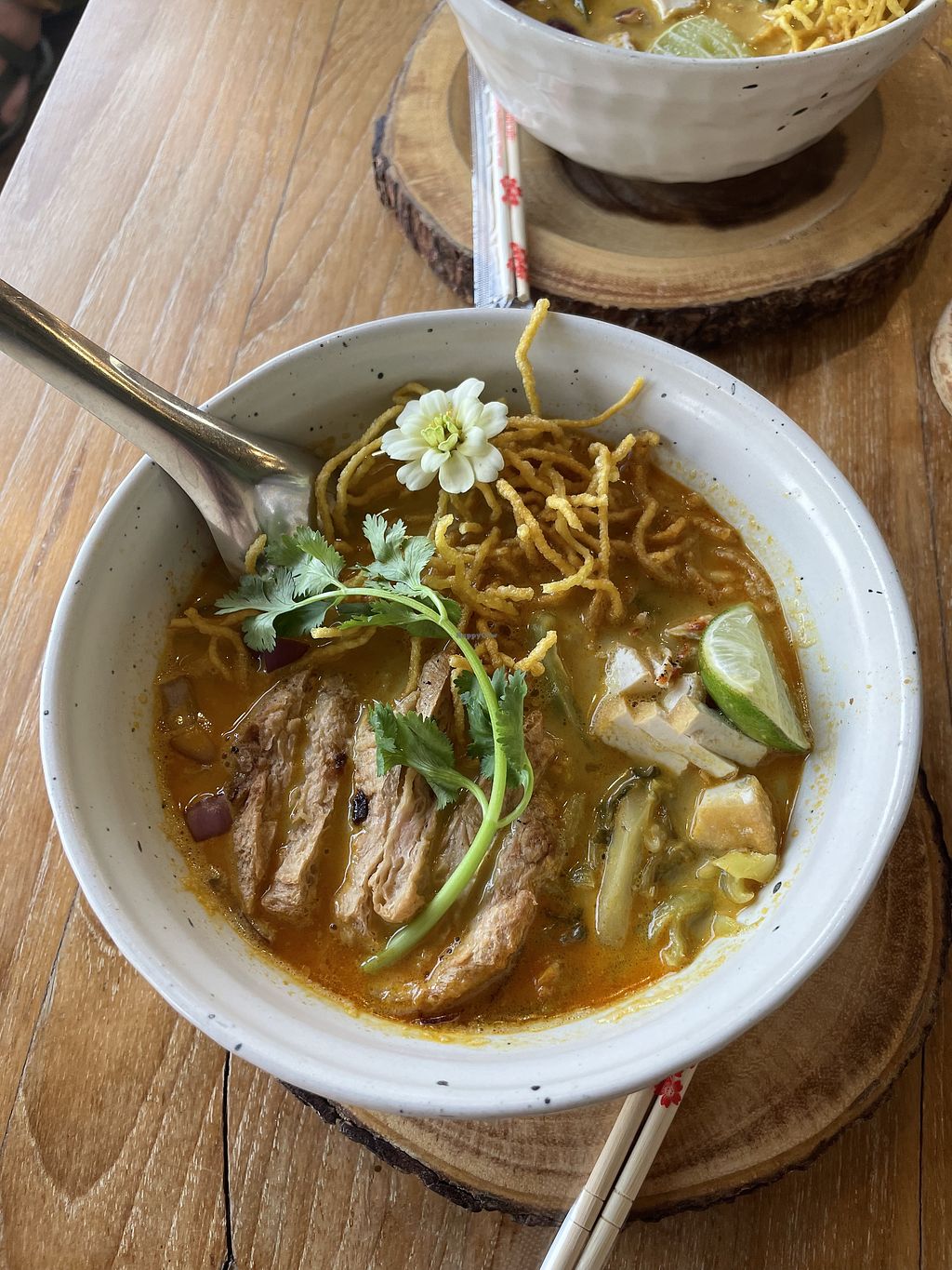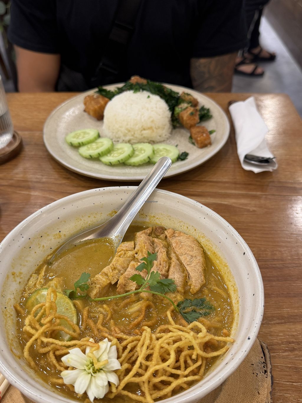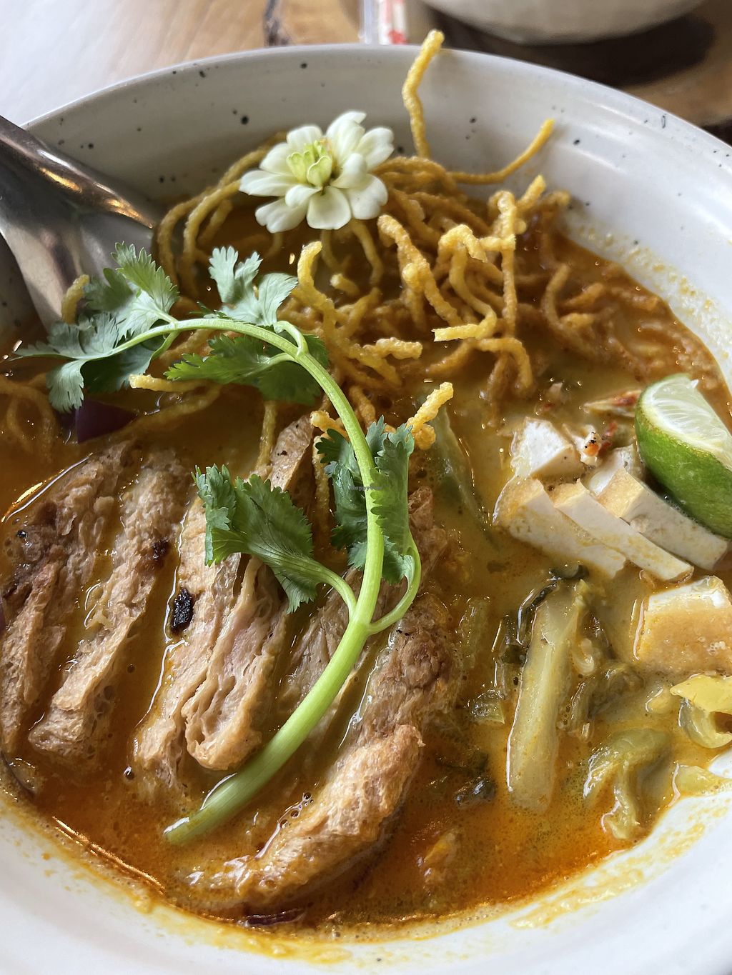 Very delicious and fresh food! I had the Khao Soi which tasted amazing (although a bit spicy, be warned!🌶️🔥) and the vegan chicken ontop was so good!😍 My boyfriend got the ‘Pork Belly’ with rice which blew us away at how much it replicated the meat - so crispy, salty & umami 🤩 Please visit here if you’re in Bangkok and support this restaurant. The staff were very friendly and attentive too 🥰