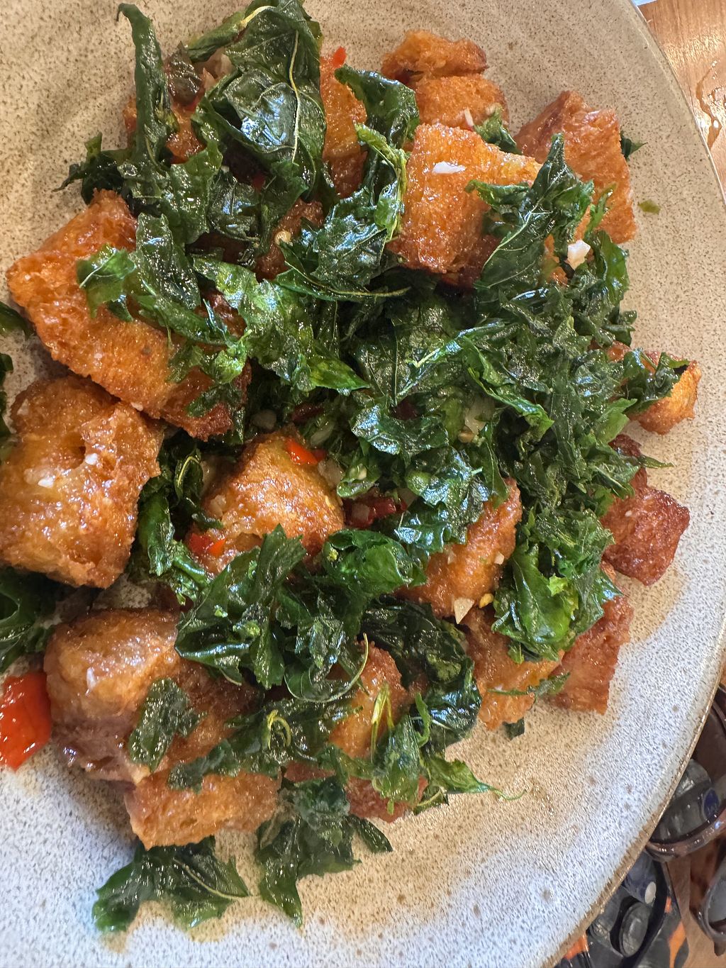 Pros: Filled croissants , Stir fried ‘crispy pork belly’ (vegan) with Basil, Everything!